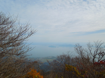 急な上りではロープが付いていて助かります。木々の間から比良の山が見えます。